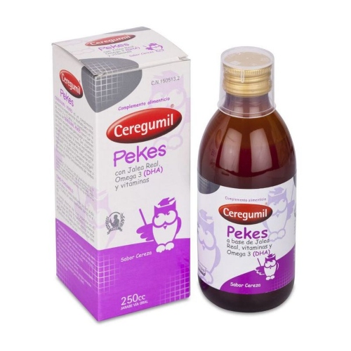 Ceregumil Pekes es un jarabe con agradable sabor a cereza, que asocia Jalea Real, Miel, Omega 3 DHA y Vitaminas, nutrientes específicos para la mente y el organismo del niño.