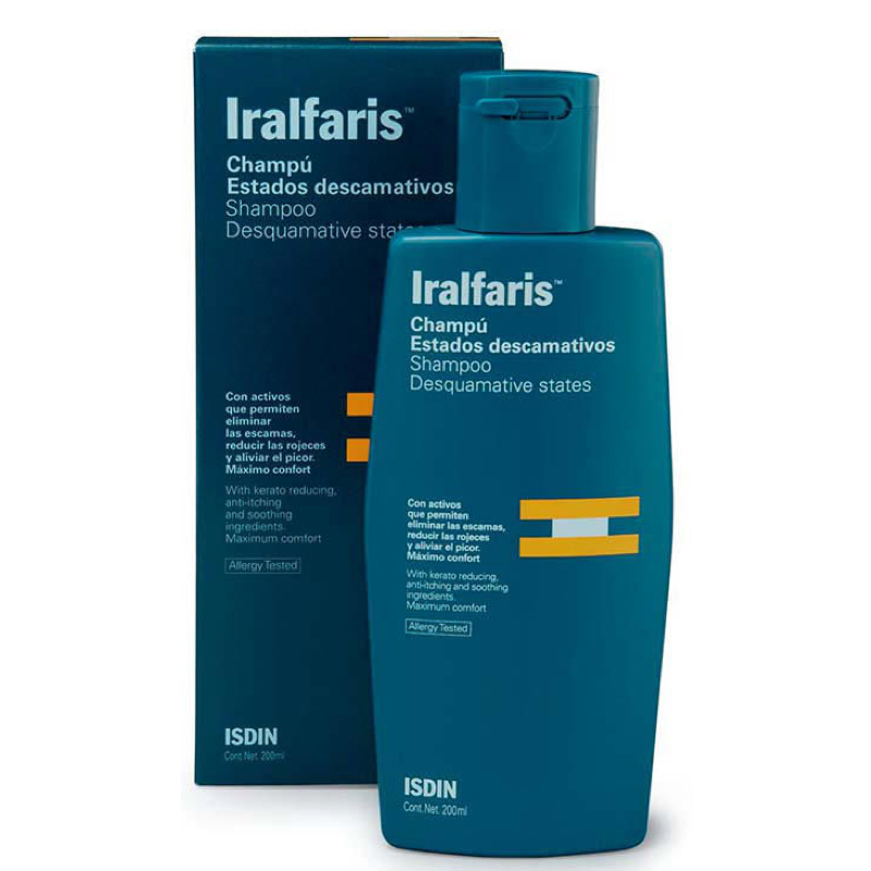 CARACTERÍSTICAS y BENEFICIOS:\r\n- Elimina las escamas y ayuda a reducir el enrojecimiento y a aliviar el picor.\r\n- Proporciona efecto acondicionador, facilidad de peinado y máximo confort en su uso.\r\n\r\nMODO DE EMPLEO:\r\nAplicar sobre el cabello húmedo y masajear hasta conseguir espuma. Dejar actuar durante unos minutos y aclarar con abundante agua. Repetir su uso 3 ó 4 veces a la semana.\r\n\r\nFuente ISDIN: https://www.isdin.com/producto/iralfaris-champu-0\r\nFuente: Consejo General de Colegios Oficiales Farmacéuticos (CGCOF)\r\nÚltima descripción recogida: 31 de Marzo de 2013.