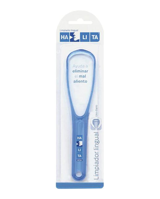 El Limpiador Lingual Halita elimina la película de bacterias productoras de gases malolientes que se forma sobre la superficie de la lengua. Sus dos caras, una de perfil ondulado, especial para adaptarse a la depresión central de la lengua, y otra de perfil liso, para limpiar los laterales, permiten efectuar fácilmente la limpieza de la lengua.
