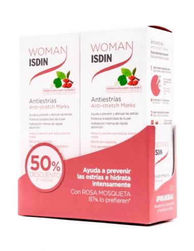 Única crema antiestrías con estudios clínicos en más de 500 mujeres. Woman Isdin Antiestrías es una crema corporal antiestrías de rápida absorción que contiene Centella Asiática, Rosa Mosqueta, Manteca de Shorea y Vitamina E con acción antioxidante. Dispone de evidencia clínica que demuestra eficacia en la ayuda de la prevención y reducción de las estrías, así como una valoración superior de su fórmula por sus características sensoriales. Previene y reduce las estrías. Potencia la elasticidad de la piel. Hidratación intensa de rápida absorción. Modo de Empleo: Aplicar dos veces al día (una por la mañana y otra al acostarse) sobre las zonas más distendidas durante el embarazo o cambios de masa corporal, masajeando suavemente hasta su absorción.